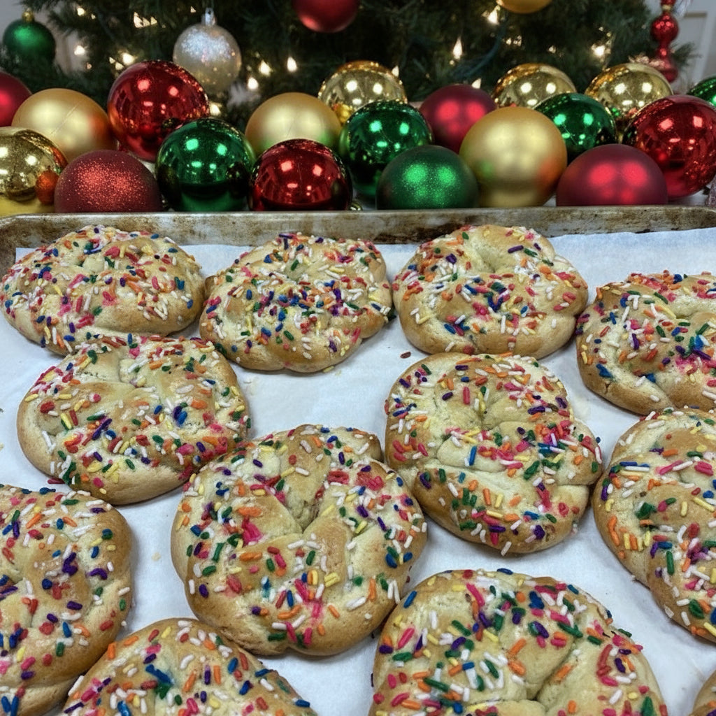 Celebrate the season with our Italian Sweet Bread, a cherished family recipe crafted into festive mini wreaths. Each wreath is adorned with vibrant sprinkles, is buttery and tender with a delicate cookie-like texture reminiscent of sweet shortbread. Slice-able and versatile, these wreaths pair beautifully with morning coffee, afternoon tea, or as an elegant dessert. Individually wrapped in cellophane with decorative holiday ribbon, they're ready to savor or gift with holiday charm. Each is 6.4 oz, 5" across.