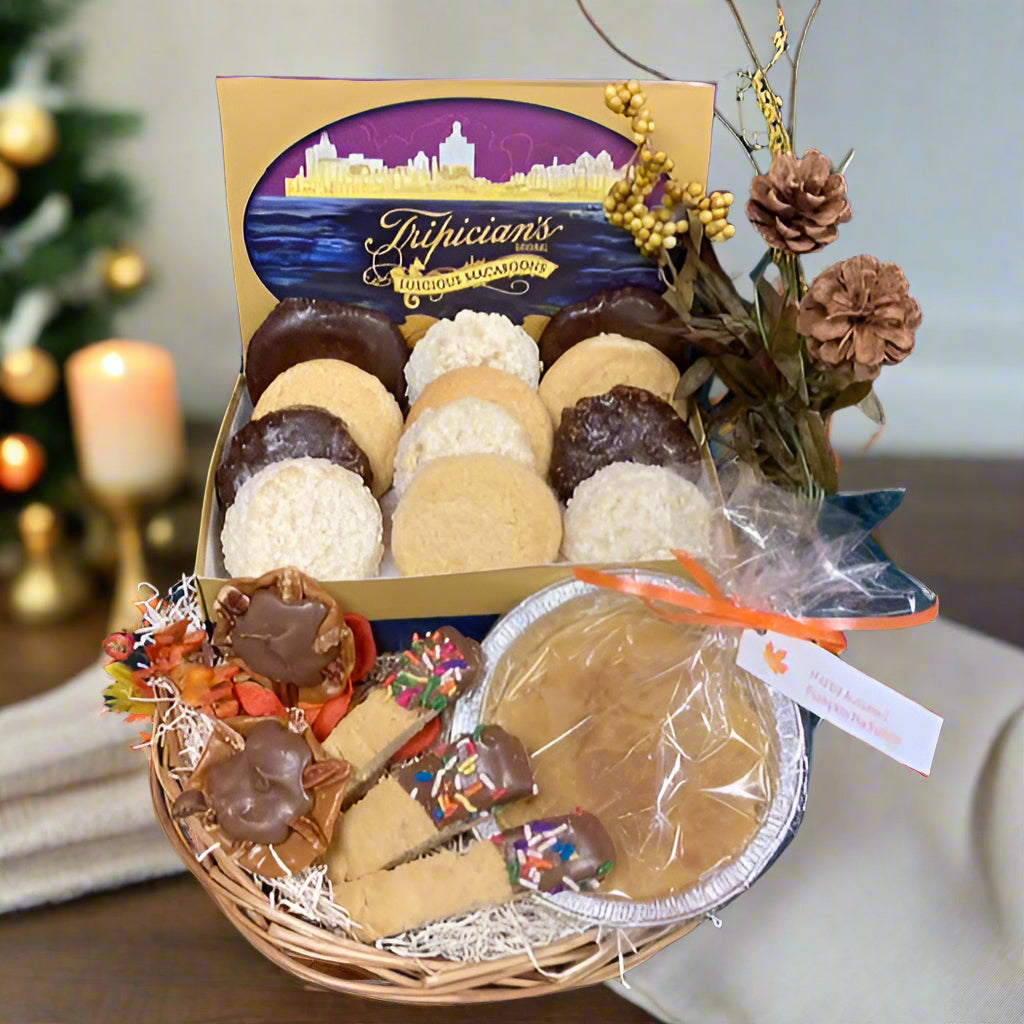 Dive into seasonal bliss with The Harvest Basket—your ticket to flavor-packed indulgence! This delightful collection brings together a dozen assorted Sampler variety of Almond and Coconut Macaroons alongside their chocolate counterparts, decadent hand made Pecan caramel turtles, clusterd pecans in gooey buttery caramel, crispy Amaretto and Almond Biscotti dunked in milk chocolate, and creamy, buttery Fudge in our favorite seasonal flavors. Handcrafted with care, it's the perfect way to celebrate the season and treat yourself (or someone special) to a little taste of everything delicious.